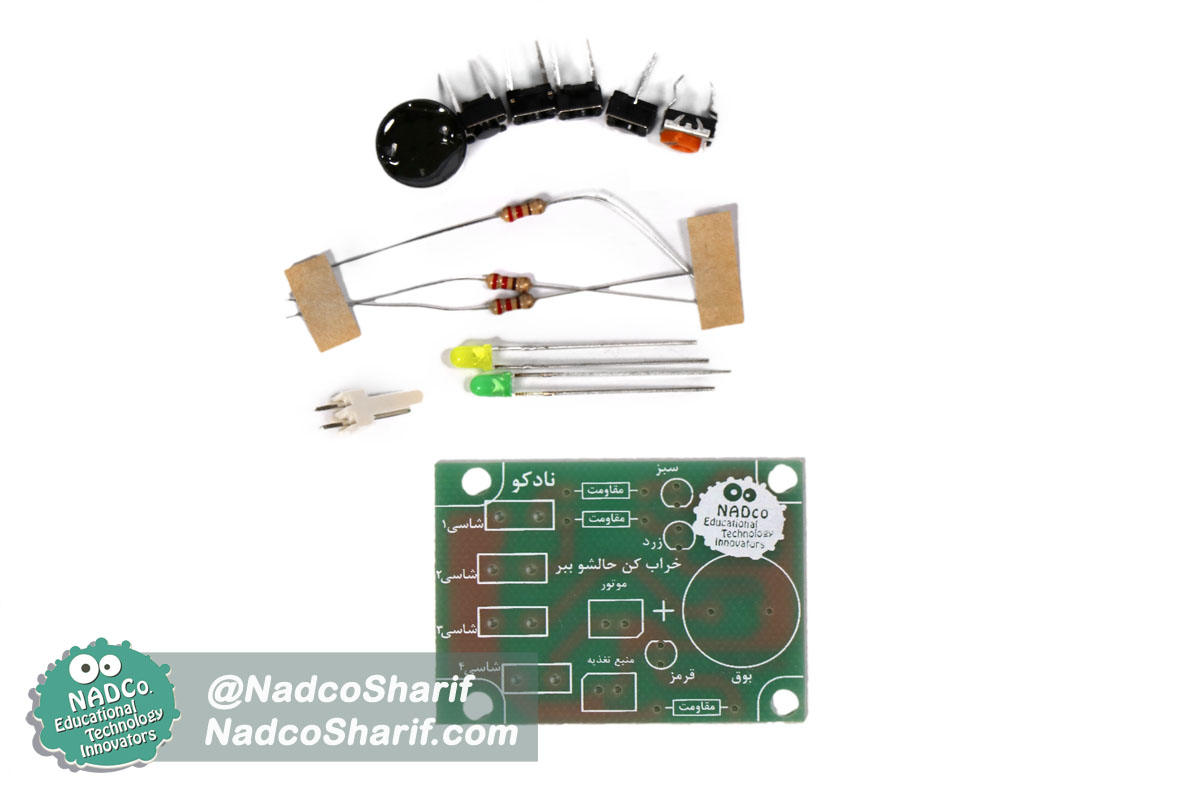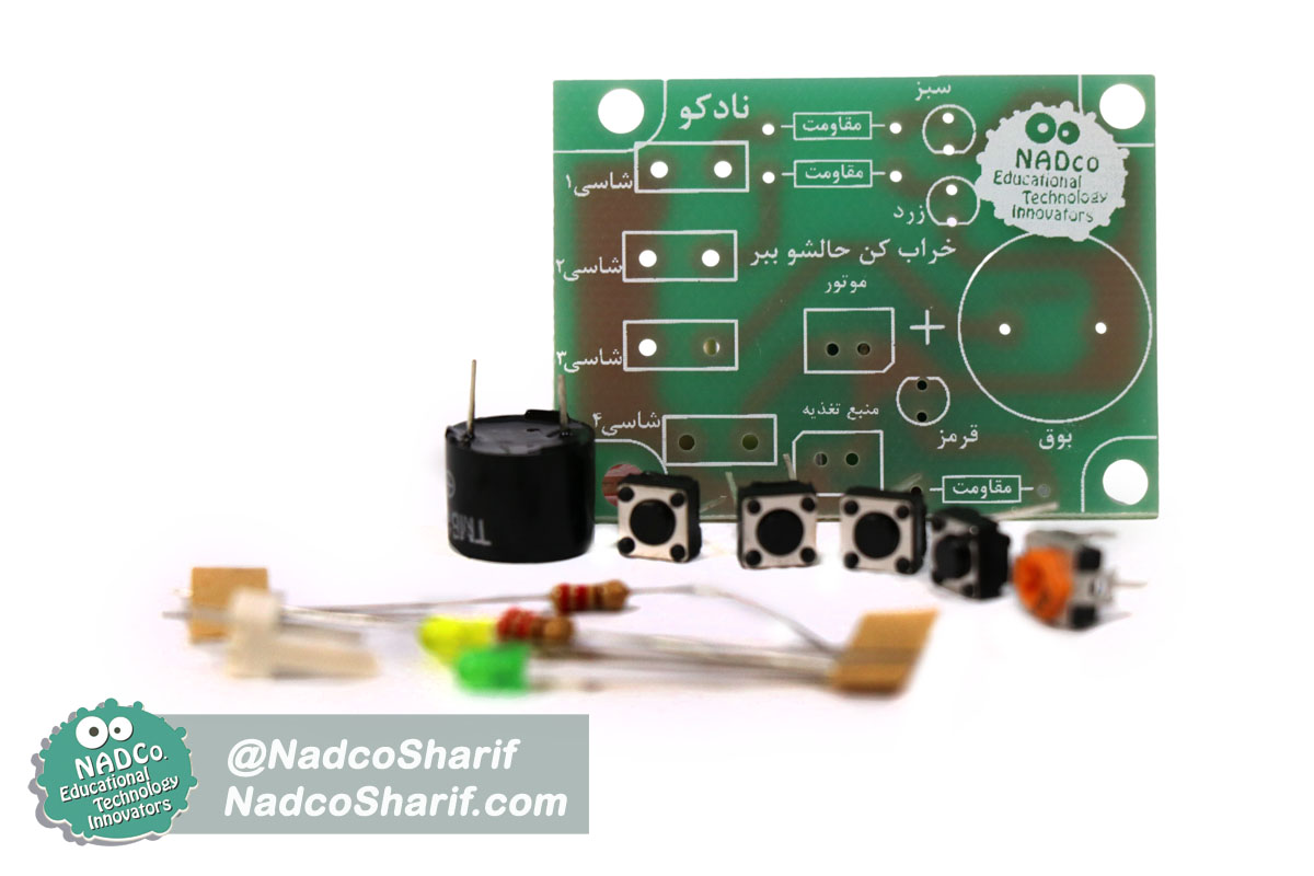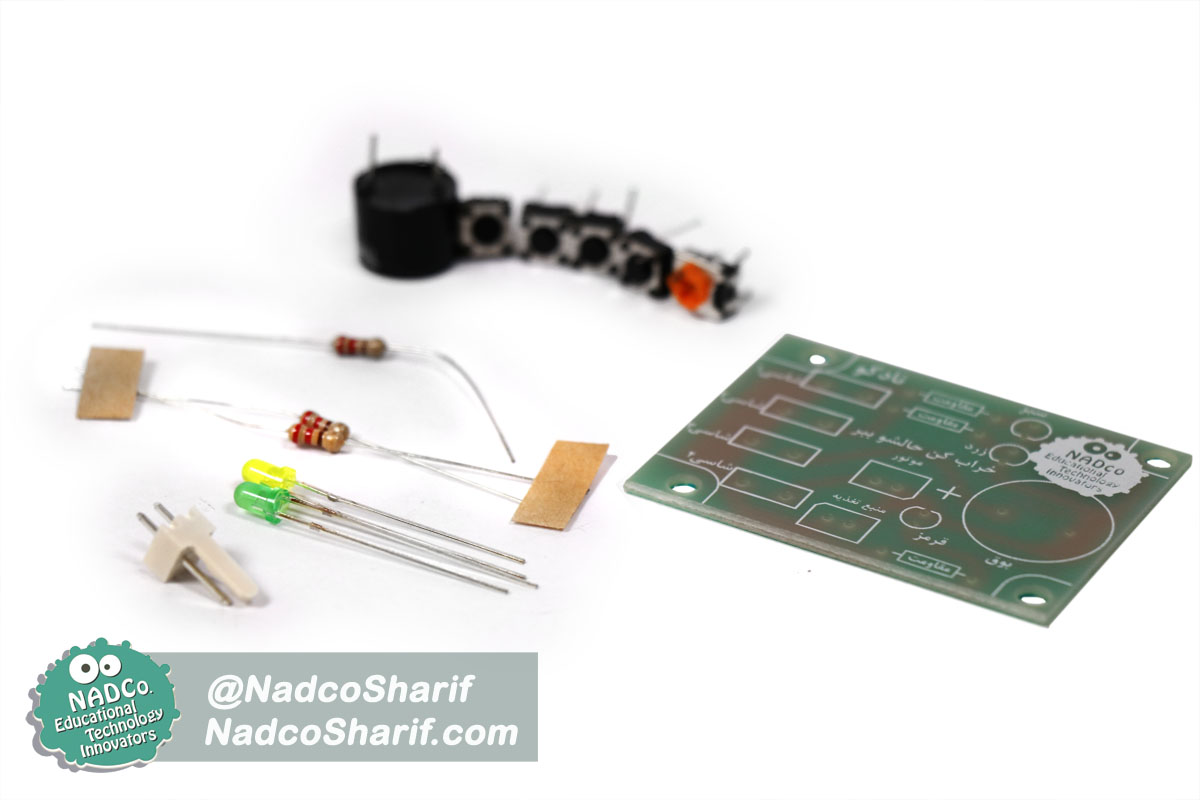 اطلاعات فنی: این بورد متشکل از یک بورد مدار چاپی در کنار ال ای دی و بازر و پالس سوییچ و مقاومت و دو پین و یک بازر می¬باشد. هدف از این بورد آموزش نحوه صحیح لحیم کاری روی بردهای مدار چاپی است. بعد از لحیم کاری و اتصال یک منبع تغذیه 3 ولتی به دو پین تغذیه بورد می توان عملکردهای مختلف المان های لحیم شده بر روی برد را مشاهده نمود.