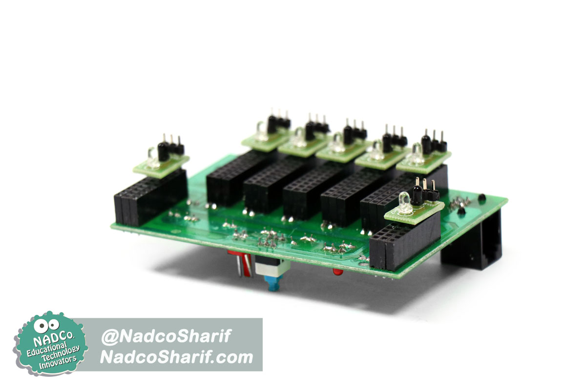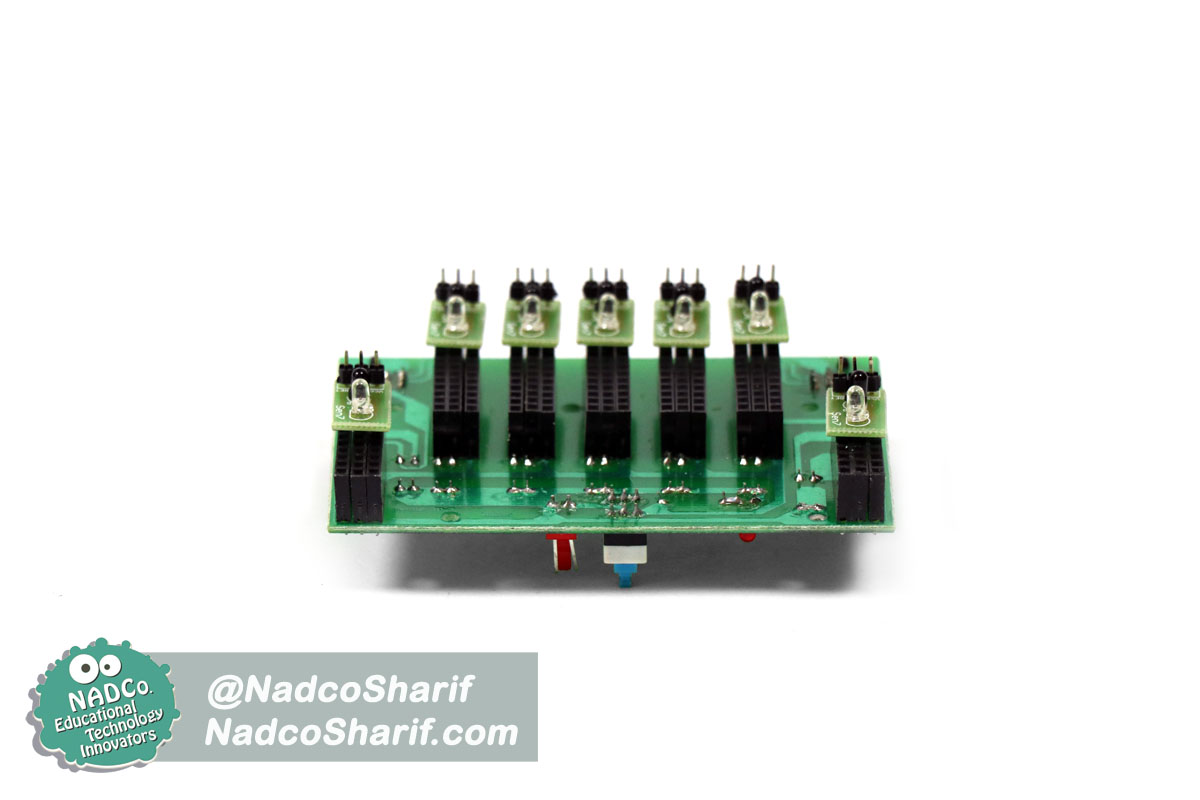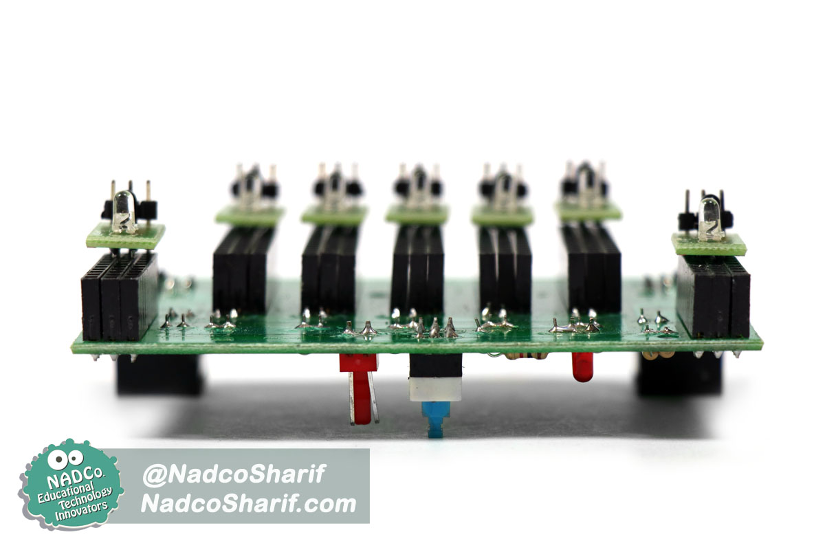 اطلاعات فنی: این بورد سنسوری شامل 7 فرستنده و گیرنده مادون قرمز می باشد که برای راه اندازی ربات تعقیب خط به کار می رود. بر روی این بورد دو سوکت وجود دارد که از طریق دو کابل دیتای 6 پین به بوردهای هوشمند متصل می شود. این سنسورها قابلیت جابجایی دارند و می توان مکان مناسب جایگیری سنسور بر روی بورد را تنظیم نمود.