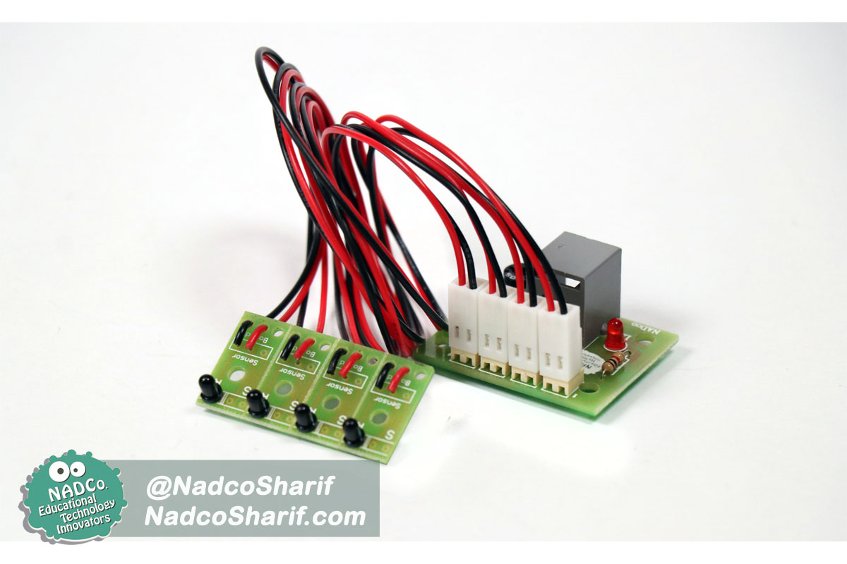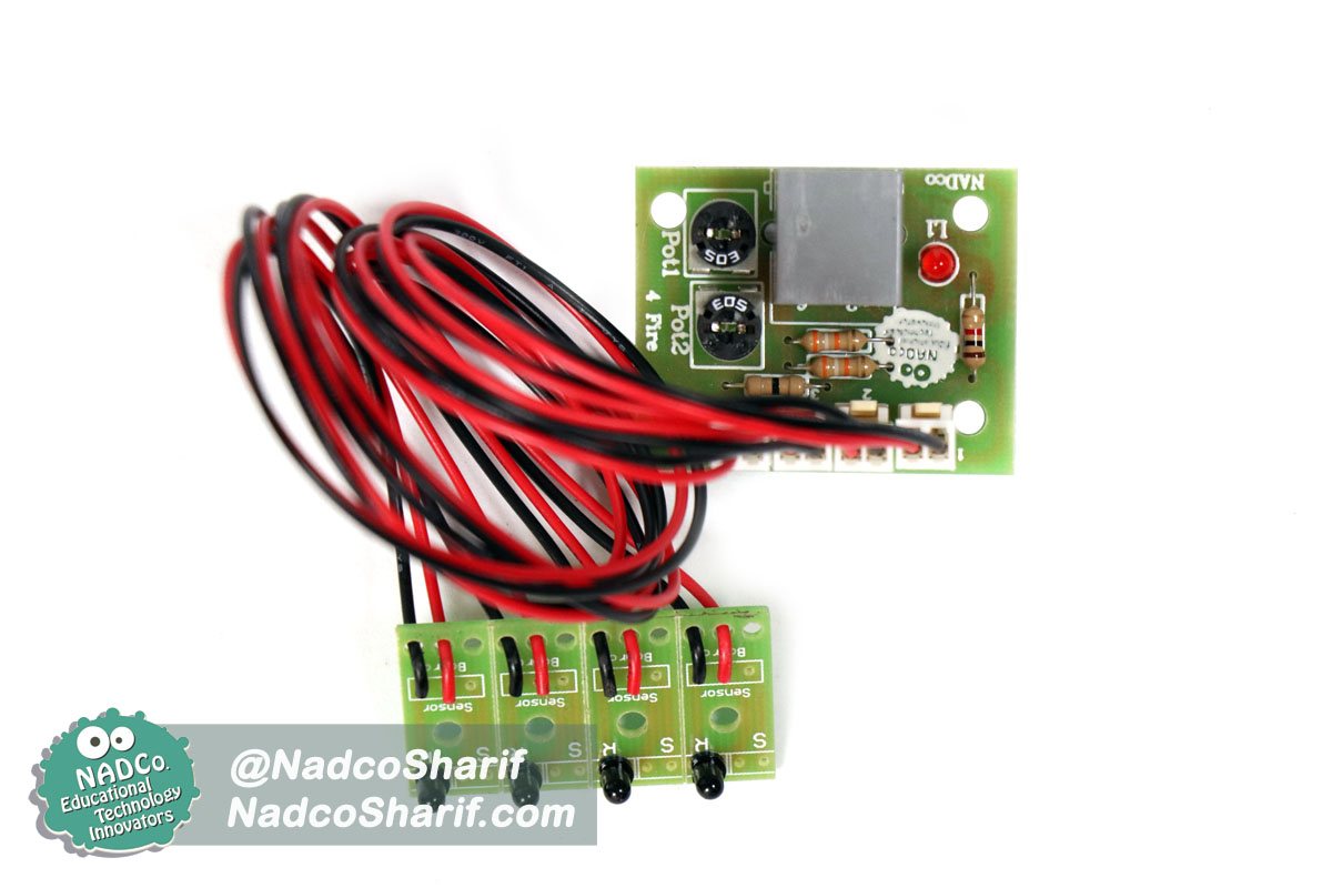 اطلاعات فنی: این بورد سنسوری از 4 گیرنده مادون قرمز تشکیل شده است که با یک کابل دیتای کوتاه به یکی از بوردهای هوشمند روبورو یا مکاترو یا الکترو متصل می شود. از این بورد می توان برای ساخت انواع ربات آتشنشان و امدادگر استفاده نمود. بر روی این بورد دو عدد پتانسیومتر می باشد که می توان میزان دریافت نور مادون قرمز توسط آن ها را تنظیم نمود.