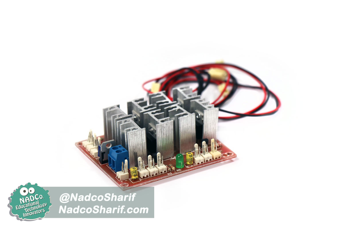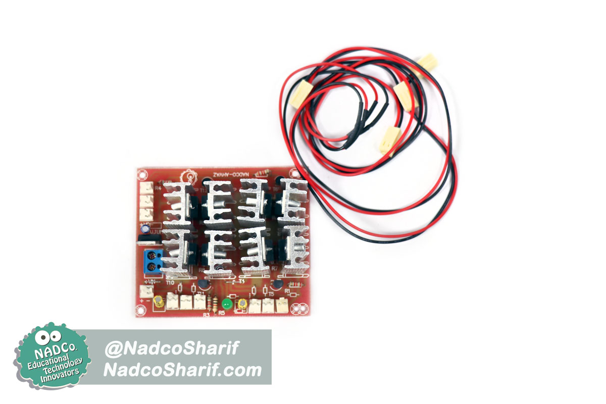 اطلاعات فنی: این بورد یک درایور راه انداز موتور برای بوردهای هوشمند می باشد. از آنجا که برای راه اندازی تعداد بیشتری از موتورها نیاز به جریان و توان بالایی می باشد و میکرو کنترلر قادر به تغذیه آن ها نیست، بنابراین استفاده از یک درایور پر قدرت نیاز می باشد. این درایور شامل ترانزیستورهای جریان بالای TIP6 می باشد که قادر است از طریق اتصال یک منبع خروجی به آن جریان و توان بالایی را برای تعداد 4 موتور برای هر سمت چپ و راست تامین کند. این درایور از طریق یک کابل فرمان حرکت موتورها را از درایور موجود بر روی بوردهای هوشمند روبورو یا مکاترو یا الکترو دریافت کرده و موتورها را راه اندازی می کند.
