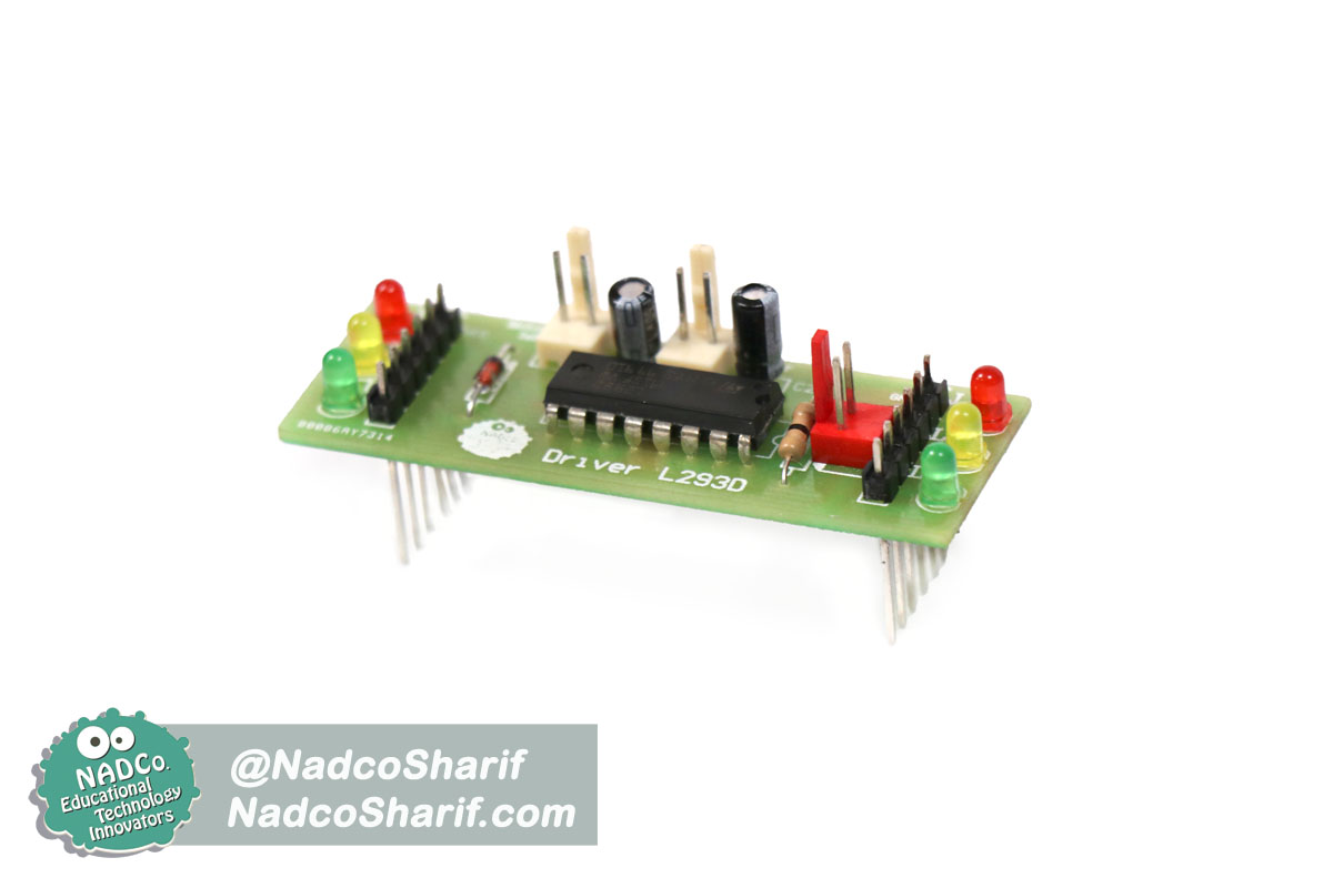 اطلاعات فنی: این قطعه به عنوان راه انداز موتور بر روی بوردهای روبورو، مکاترو و الکترو مورد استفاده قرار می گیرد. از آنجا که پین های میکروکنترلر جریان لازم برای راه اندازی موتورها را نمی توانند تامین کنند، بنابراین از درایور به عنوان افزایش دهنده جریان و راه انداز موتور استفاده می شود. در این بورد از آی سی L293 استفاده شده است که توان جریان دهی ماکزیمم 1 آمپر را دارد.