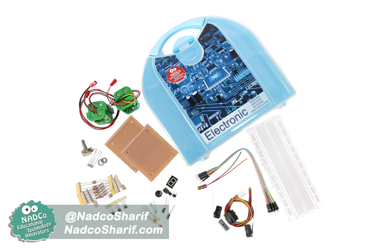 اطلاعات فنی: این کیت شامل قطعات الکترونیکی است که با کمک آن ها و طرح درس مربوطه می توان مدارهای الکترونیکی بسیاری را بر روی برد بورد بسته و راه اندازی نمود و نحوه عملکرد آن ها را مشاهده کرد. درک و آموختن پایه علم الکترونیک از مباحث این بسته آموزشی بوده و مقدمات ورود به دنیای الکترونیک را فراهم می کند.